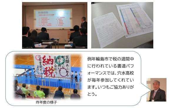 松岡税理士事務所より松岡勤五氏をお招きし、税に関する講話を行っていただきました。税にはどんなものがあるか、給料から引かれる税金について、税金がどのように使われているか、などといった基本的なことから、地震などの災害に使われる税、雑損控除などについてもわかりやすくお話ししていただきました。