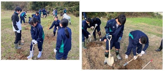2024年11月14日 14時36分11月13日(水)、1年生が里山保全のための植林活動を穴水町明千寺付近の山林で行いました。奥能登原木シイタケ活性化協議会やJA全農いしかわ、奥能登農林総合事務所等の方々のご指導のもと、生徒達はグループごとにコナラの苗木250本を植え込みました。