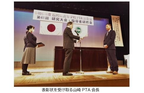 穴水高校PTAが、大聖寺実業高校、金沢二水高校とともに今年度の優良PTA校に選ばれ、山崎与志雄PTA会長に賞状が授与されました。また、高P連活動振興功労者表彰で本校PTA活動に長年貢献していいただきました苗代香織さんが功労者賞を受賞されました。