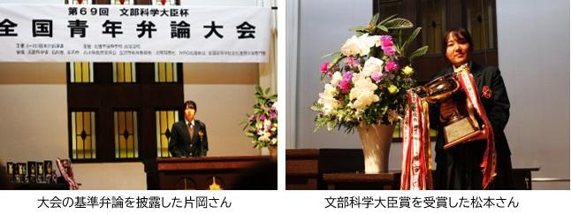 また、11月10日(日)に、金沢市の北陸学院中学校・高等学校栄光館で行われた第69回文部科学大臣杯全国青年弁論大会では県大会に引き続き松本心和さんが出場し、石川県勢としては11年ぶり、本校弁論部としては初めての最優秀賞(文部科学大臣賞)を受賞しました。また、片岡日和さん(3年)が大会の基準弁論を行い、お手本となる弁論を堂々と披露し特別賞を受賞しました。