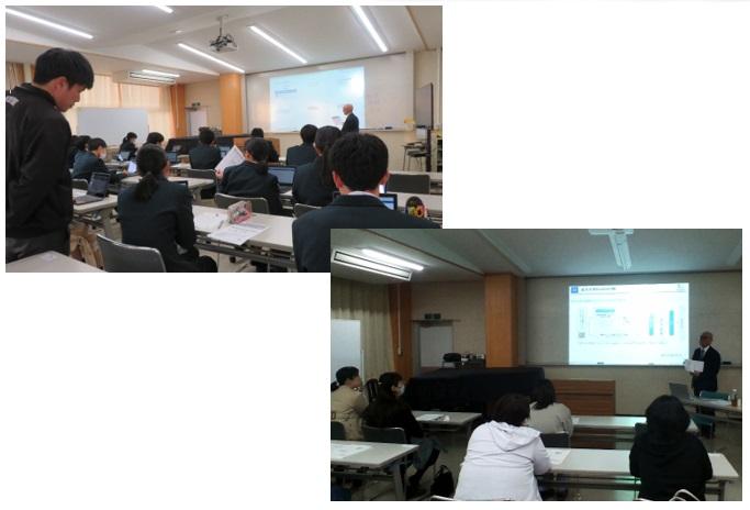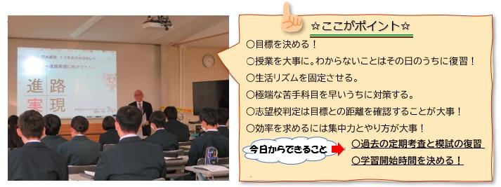 7限の時間帯には生徒を対象に、主に4年制大学への進学を考えている生徒に向けての説明会が行われました。大学進学を目指す上での入試のポイントと学習の進め方に絞り、詳しく説明していただきました。