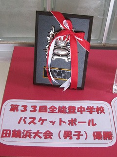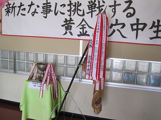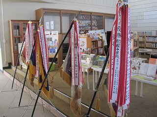 5月9~10日に行われた、鳳珠郡中学校体育大会で勝ち得た優勝旗が、1階図書室前に並びました。