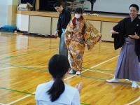 能の歌い方や構え、演じ方を教えてもらい、自分たちも実際に歌ったり演じたりしました。