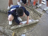 生徒には、ひとり1本、桑の木が手渡されました。 電動ドリルを使って菌を埋め込む穴をあける作業では、電動ドリルを始めて使う生徒もおり、初めは恐る恐る持っていましたが、後半には慣れてきてスムーズにできていました。