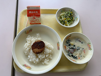 コンソメライス,石川県産のメンチカツ,水菜とコーンのサラダ,地物産物たっぷりシチュー,牛乳