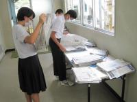 学級ごとに担当地区をまわり、商店街や住宅地内はとてもきれいで、目立つゴミはあまりありませんでしたが、大きい道路の歩道や家のないような道沿いには、ペットボトルやタバコの吸い殻、空き缶などが目に留まりました。中には、ビニール袋いっぱいにして学校に帰って来る生徒もいました。みんなが拾ってきたものを分別して集めてみると、ペットボトルや空き缶、燃えないゴミ、燃えるゴミがそれぞれ大きな袋にいっぱいになるほど集まりました。そのゴミの多さにびっくり。一人ではほんの小さなことしかできないかもしれませんが、たくさんの人(全生徒)が集まれば、すごい力になります。今日は、町も心もきれいになりました。