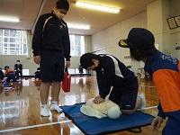 その後,5つの班に分かれて心肺蘇生法(胸骨圧迫とAEDの使用方法)の実技講習を一人ずつ体験し,最後に修了テストを受けました。