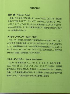 10月4日(金) ブロードウェイで活躍されている由水南さん、ケイティ・ファッファルさん、ピアニストのべナル・タンリセバーさんによるコンサートが行われました。トルコからの高校生による素敵な歌声も披露されました。本場ブロードウェイの雰囲気を楽しむことができたとても素敵な1時間でした。