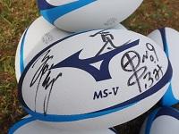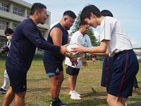 公演後,グラウンドで3名の選手とラグビーボールを使って交流しました。