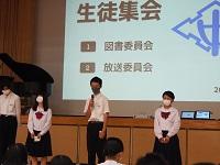 生徒集会は,各委員会で取り組んだことや調べたことを全校生徒の前で発表することを通して,よりよい学校生活について考えることを目的としています。