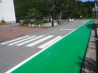 校舎前の道路に緑色の歩道が完成! 交通安全に努めよう。