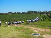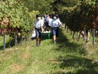 村山社長さんから、醸造所を案内してもらい、その後、収穫する際の注意を聞いて、子供たちは、たわわに実った赤ワイン醸造用のぶどうを収穫に挑戦しました。ひとり一人、とても丁寧に房をハサミで切り取り、「まだ、籠はありませんか。」と用意された籠が足りないほど収穫することができました。この日、収穫されたぶどうの量は400キロ。この後、赤ワインとして醸造され、5年間、「能登ワイン」の蔵で熟成されます。そして、3年生が20歳になった成人式で記念品として贈られます。