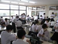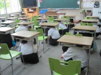 5月24日(月) 地震と同時に火災が発生したという想定で、全校避難訓練を行いました。15:00緊急地震速報が流れ、生徒はすぐに机の下に潜り込む。1分後に地震が収まったが、調理室から火災が発生し、すぐに第2体育館へ避難せよという放送による指示が入る。生徒は、静かに廊下に並び、体育館へ移動。