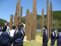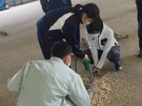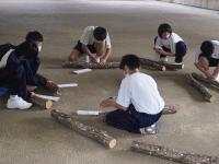 長さ90cmのコナラの原木にドリルで穴をあけ、1本につき35~40個ほど、開けた穴に手で菌を植えました。一人2本ずつ作業をし、1本は家に持ち帰り、もう1本は学校で保管して育てていきます。