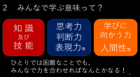 集会では、全校生徒に課題が出されて、その問いをみんなで答える形式で行われました。生徒からは、色々な視点からの考えが出され、たくさんの友達と一緒に考える楽しさや多様な考えに触れる面白さなどを実感しました。生徒、教師ともに、学ぶことが楽しいと思える授業を、生徒、教師でつくっていきたいと考えています。今年度から、学校では「学び合い、認め合い、輝き合い」を大切にして、授業をはじめ様々な活動を行っています。
