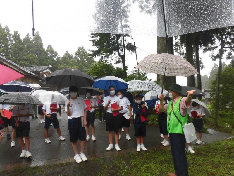 7月14日に、1年生は「総合的な学習の時間」に地域散策として諸橋地区に出かけました。天候はあいにくの雨となってしまいましたが、みんな真剣に聞き、メモを取る姿がとても印象的でした。今回は、バスで諸橋地区に向かい、明泉寺と太夫の森を見学しました。里ナビさんから各所の詳細について説明をしていただき、知っていたこと、知らなかったことも含めて、自分たちが住む穴水町について、より深く学ぶことができました。
