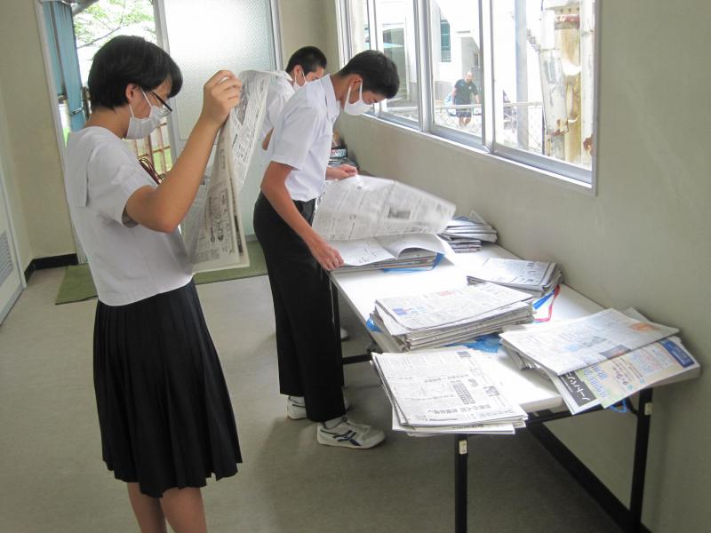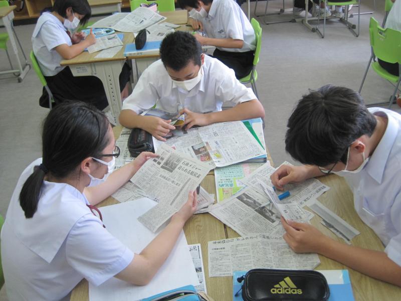 3年生が総合的な学習の時間にNIE(Newspaper In Education)の取り組みを行っています。「SDGs(持続可能な開発目標)」の17の大きなテーマから、一つ選び(例 「貧困をなくそう」「質の高い教育をみんなに」「つくる責任 つかう責任」など)、そのテーマに関する新聞を切り抜き、壁新聞制作に取り組んでいます。世界において、どんなことが問題で、どうすればそれを解決していけるのかなど、新聞の切り抜きを通して、訴えようとしています。制作は、読む人の側を意識して作られていて、根拠や自分たちが伝えたいことを明確にしつつ、魅力的に表現しようと頑張っています。