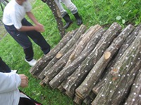 菌打ちが終わった原木は,桜の木の下に積まれました。 このまま7月初旬まで,朝露や初夏の風に吹かれながら,自然の力で育ちます。