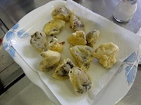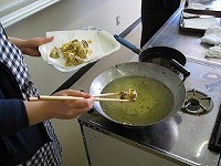先日収穫したしいたけを,1年生が調理しました。 作ったのは,てんぷらとチーズ焼きです。
