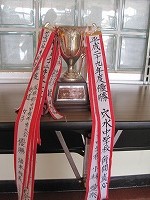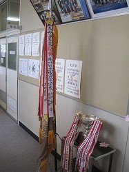 | 日頃の努力が実を結びました。 剣道部女子のみなさん,優勝おめでとう! 生徒玄関に,優勝旗,トロフィーが飾られています。 朝日を浴びて,トロフィーが輝いています。 深紅の優勝旗がまぶしいですね。 | |