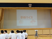 1学期最後のこの日,穴中タイムが行われました。 今回の穴中タイムでは,クラス対抗で,『イントロクイズ』,『学校クイズ』 に挑戦しました。 結果は,1位:3年1組,2位:3年2組,3位:2年2組 でした。 さすが,高学年が上位独占です★ クラスで団結し,楽しみながら過ごすことができた時間でした。