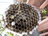 | 盆栽か? と思ったら・・・なんと,ハチの巣!! 学校前のツツジの木に,ハチの巣が作られていたのを,子供たちが発見しました! 生徒たちが刺されたら大変です。 大騒ぎになる前に撤収しました。 巣の中には,ハチの子が入っています。 それにしても,正確な六角形がきれいに並んでいますね。 | |
