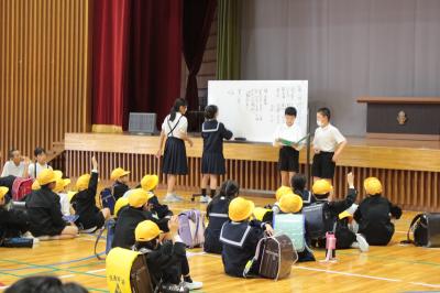 4月17日(水)5限目に地区子ども会が行われました。9つの地区毎に各会場に集まり、役員の紹介、集団登校についての確認、生活のきまり(帰宅時刻・自転車・危険個所・「いかのおすし」など)の確認、地区行事についての話、交流ゲームなどを行い、集団下校をしました。みんなで確認したり学んだりしたこと忘れず、安全に気を付けて仲良く行動していきましょう。