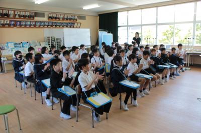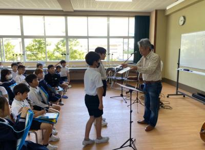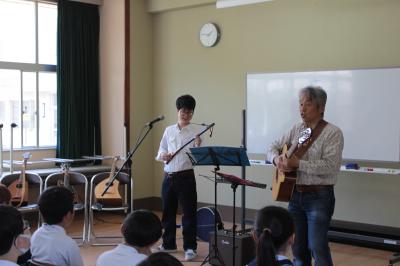 4年生は、総合的な学習の時間に福祉について学習します。5月10日(金)5・6限目には、講師に白山市在住の川崎正美さんと草汰さん親子をお招きして、障害と福祉について学びました。障害と向き合い、苦手や困難なことがあっても大好きな音楽を通して、よりよい社会とみんなの幸せを願って努力し活動するお二人。いきいきと演奏をしたり歌ったりする姿とその美しい音色や歌声に、自然と手拍子が起こり笑顔が溢れました。これからも、さらに福祉について理解を深めていきます。川崎さん、ありがとうございました。