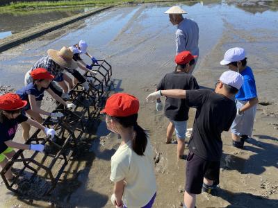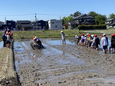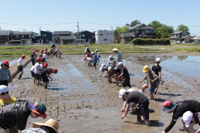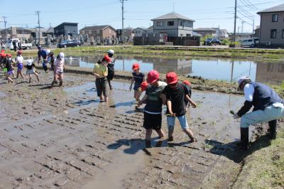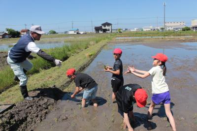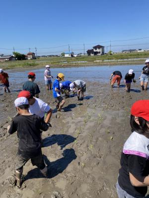 5月14日(火)9時から、5年生が地域の佐々木さんと米多さんを講師にお迎えし、田植え体験を行いました。絶好の田植え日和となり、保護者・ご家族の方も応援に駆けつけてくださいました。挨拶の後、初めにわく転がしの説明を聞き、等間隔で苗を植えるための準備をしていいよいよ手植えです。ほとんどの児童が初めての体験とあって、最初は田んぼの深さやどろの感覚に戸惑っていた児童も、次第に慣れてどんどん植え進み、苗のお代わりをする様子も見られました。田植えの大変さ・みんなで作業をする楽しさをたっぷり味わうことができました。収穫が楽しみです。