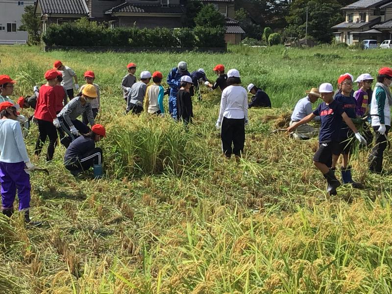 9月14日に5年生による稲刈り体験学習がありました。地域の佐々木さん、米多さんに教えてもらい、みんなでがんばって稲刈りをしました。コンバインでの脱穀作業や落穂ひろいも率先して行っていました。