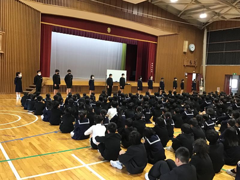 4年ぶりに全校あつまっての集会が行われました。R5年度の児童会役員、地区子供会役員の任命集会です。児童会役員と各委員会の委員長が全校の前で抱負を述べました。どの子もしっかりとした口調で、こんなことがしたい、と学校がよくなるための提案ができました。