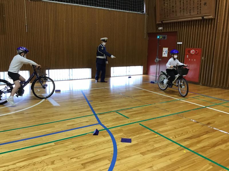 3年生は、体育館で実際に自転車に乗り、安全な乗り方を学びました。