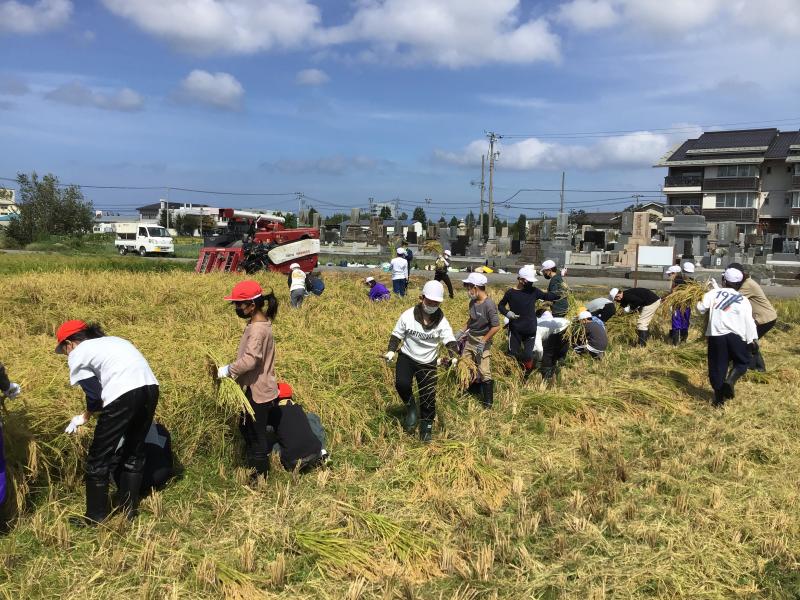9月14日、秋晴れの下、5年生の稲刈り体験が行われました。地域の農家の佐々木さん、米多さんに教えていただきながら無事稲を刈ることができました。稲を刈り、束ねてコンバインでもみをするという一連の作業を経験しました。春から米作りの体験をしたり田んぼの観察をしたり農作業について学んだりしてきましたが、こういう作業が続いてお米ができることを実感できたようです。佐々木さん、米多さん、ありがとうございました。