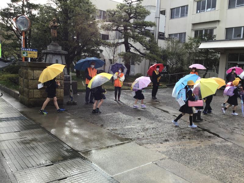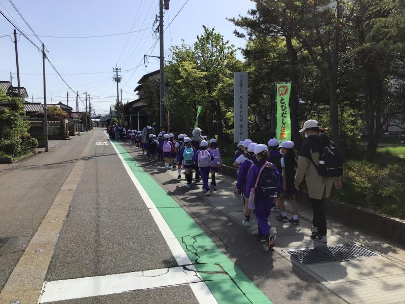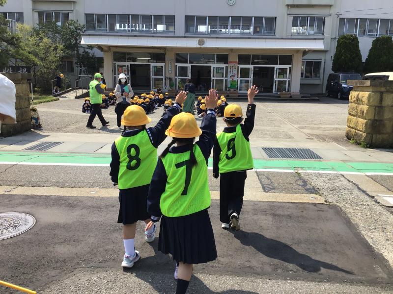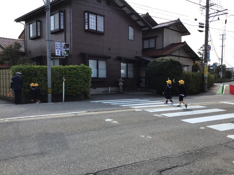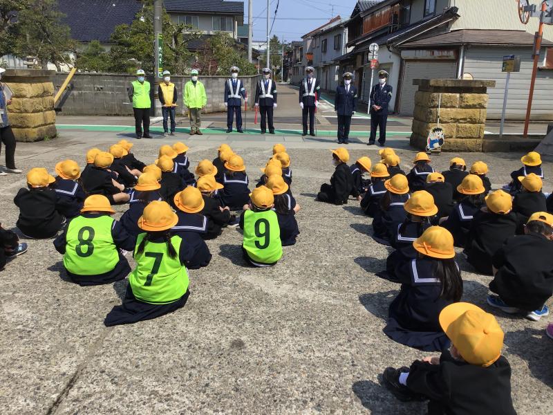1年生の交通教室では学校の近くの道路を実際に歩きました。信号のあるところ、横断歩道だけあるところ、信号も横断歩道もないところの歩き方を学習しました。警察の方や交通推進隊の方、見守り隊の方に教えていただきました。ありがとうございます。