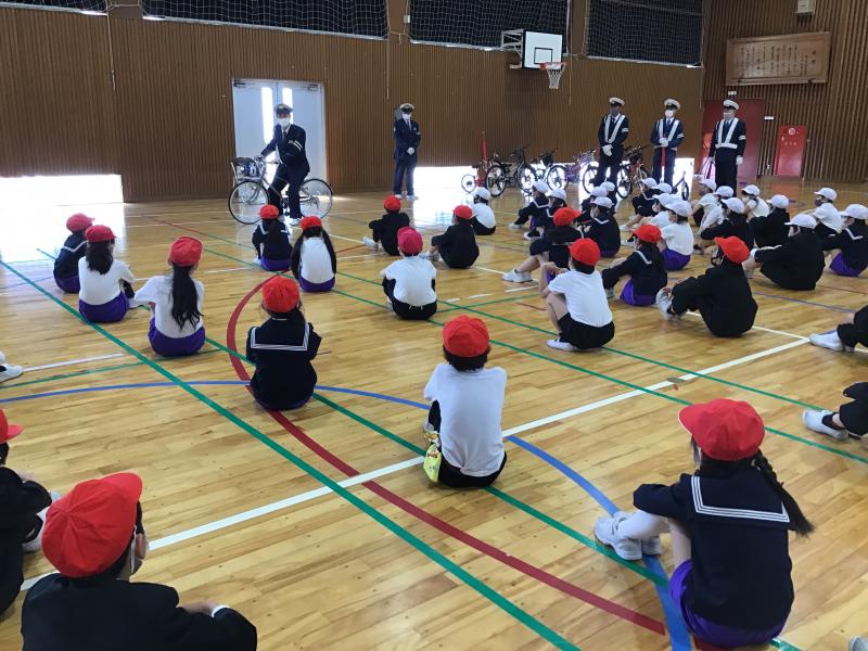 3年生は、体育館で実際に自転車に乗ってみました。見通しの悪いところ、横断歩道や信号のあるところ、障害物のあるところの乗り方を、警察の方と交通推進隊の方に教えていただきました。