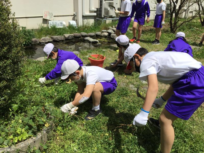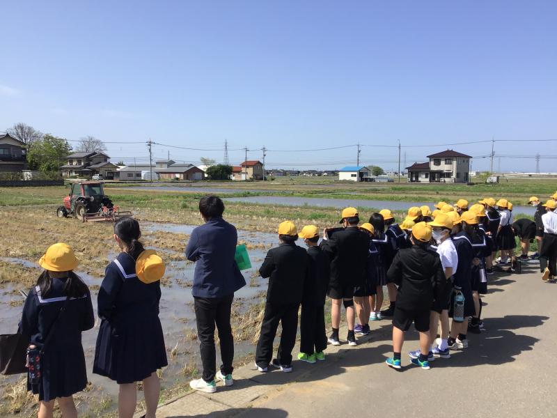 そのころ、学校では5年生は、しろかき見学と草むしり、がんばっていました。
