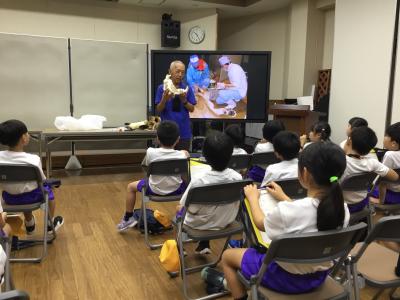 2年生が、国語科「どうぶつ園のじゅうい」の学習の一環で、いしかわ動物園を訪れ、獣医さんに直接お話を伺いました。児童は、興味深く画像を見たり質問をしたりしながら、初めて知ったことや大切だと思ったことをメモして、教科書には載っていないお仕事を知り、学びを広げることができました。この日は、お天気も良く、園内をぐるっと周って楽しむことができ、「また来たい!」という声がたくさん聞かれました。獣医さん、園の皆さん、ありがとうございました。