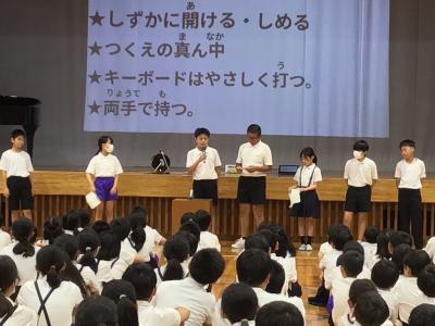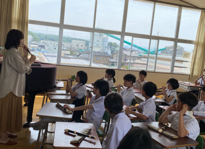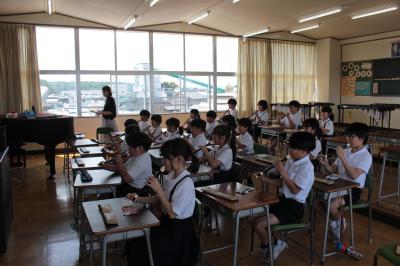3年生が音楽の時間に「リコーダー講習会」を行いました。講師の先生(山屋楽器さん)をお招きし、ソプラノリコーダーの正しい扱い方や演奏の仕方を教えていただき、美しい音色を出すためのコツを学びました。また、たくさんの種類のリコーダーの演奏を聴かせていただき、リコーダーの魅力をたっぷりと味わうことができました。これから練習して演奏が上達しますように。