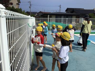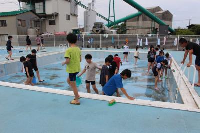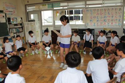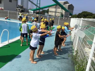 7日(月)、1年生が、酷暑のため延期になっていた水遊び(生活科)を行いました。身近なものを使って水を遠くへ飛ばしたり、勢いよく飛ばしたりしながら、的当てを仲良く楽しんだ後は、小プールで久しぶりの水の感触を味わっていました。工夫しながら、熱い夏を楽しく過ごしましょう。