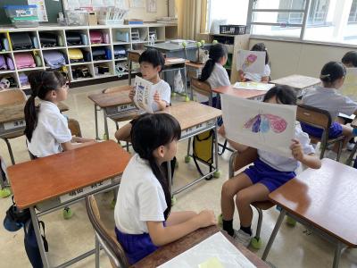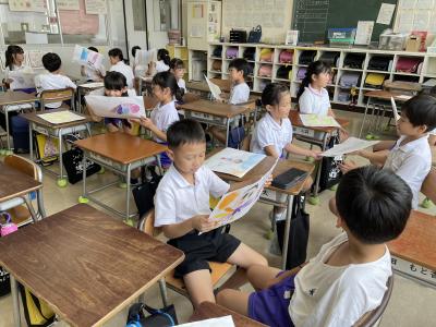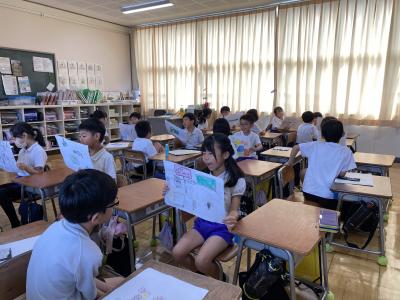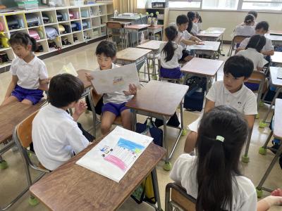 2年生が、国語科の「あったらいいなこんなもの」の学習で、一人一人書きまとめた成果物を、1・2組でペアになって紹介し合いました。この時間のめあては、「質問をすること・感想を伝えること」です。緊張しながらも、めあてを達成して満足そうな姿が見られました。今後も学びを広げ、深められるといいですね。