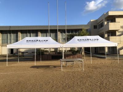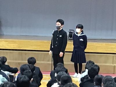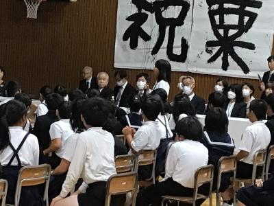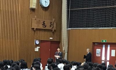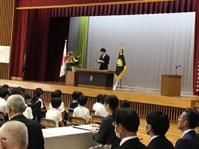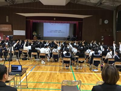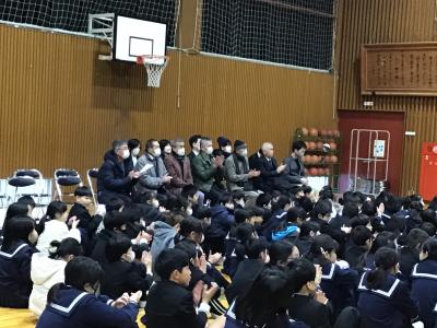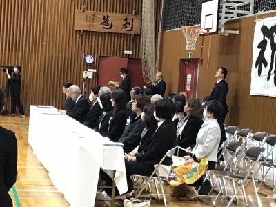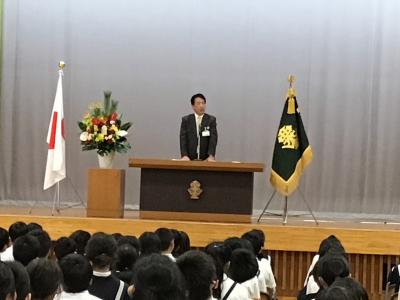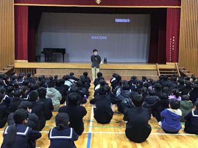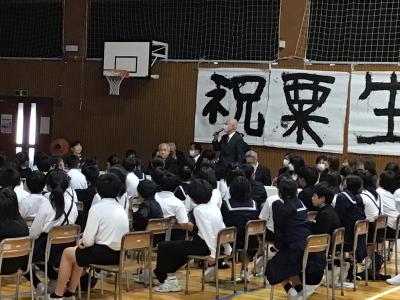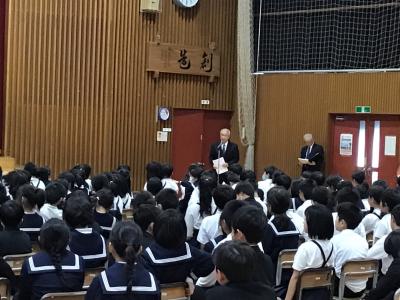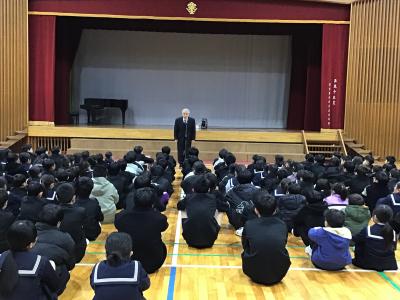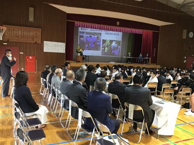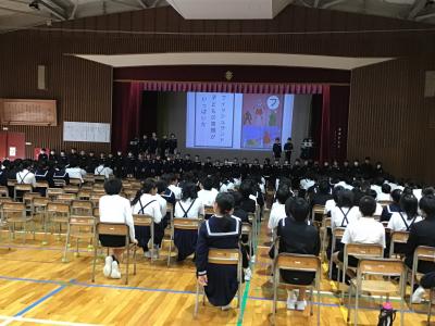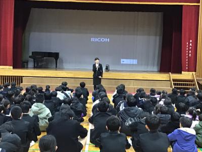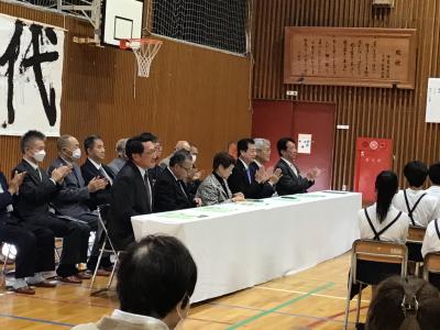 本来なら全員で木に土をかける作業をしてもらう予定でしたが、あいにくの天候で、体育館での式典となりました。