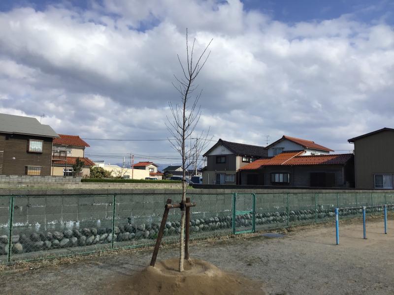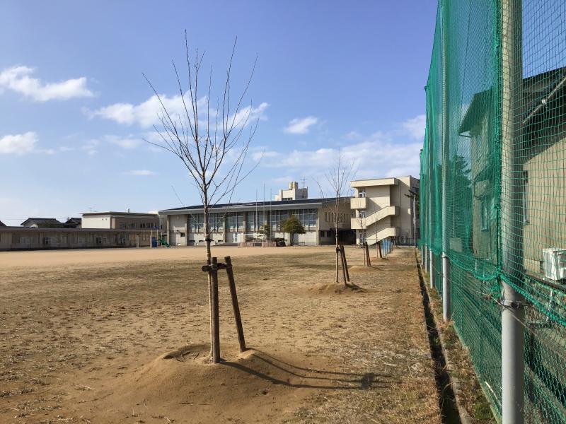 創立150周年を記念して、各町会と学校運営協議会からのご寄付で運動場に桜の木を5本植えました。