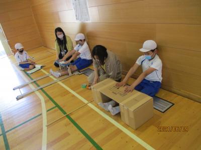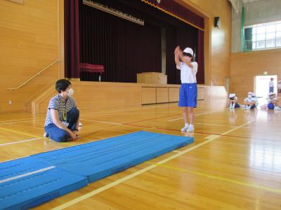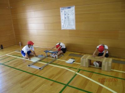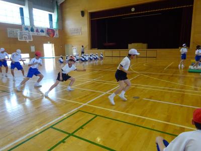 体育館は今も立ち入り禁止のため,できていなかった体育ですが,玄関スペースを広くしたり,会議室の物を動かしたりして少し広い場所を確保し,再開しました体育館用具庫から,玄関スペースでも使えそうな用具を先生達で相談して出してきました。マット,ラダー,なわとびなど,いつもの体育よりも大きな動きはできませんが,体を動かすことができると気持ちも晴れやかになりますね体育の最初にしている体つくり運動も,久々でしたが,3年生とても上手でした友達と一緒にタイミングを合わせてなわとびを跳ぶのもバッチリおみごとです