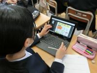 4年生は2学期末から「石川県の伝統工芸のよさを伝えるリーフレット」を作っていました。社会の学習ともつなげながら,石川県にはどのような伝統工芸があるのか調べ,さらに一人一人が興味を持った伝統工芸をくわしく調べ,よさを伝えるリーフレットを作りました。そのリーフレットを静岡県磐田市立東部小学校4年生と交流する約束をしていました。