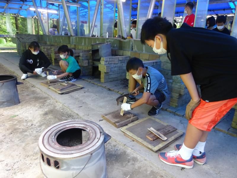 米とぎ・野菜切り・薪割り・火起こし・かまどで炊飯・かまどでカレー煮込み…と,