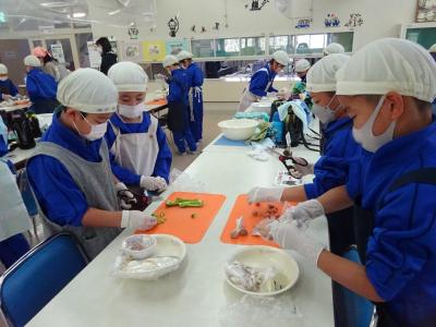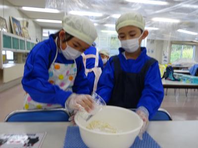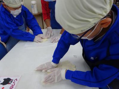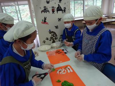 その後は,早速,今まで捨てられていたおからを使って3~4人のグループに分かれて,ピザ作り体験を行いました。まずは,野菜を調理ばさみを使ってカット。その後は,おからを入れた生地つくり,そしてトッピング。