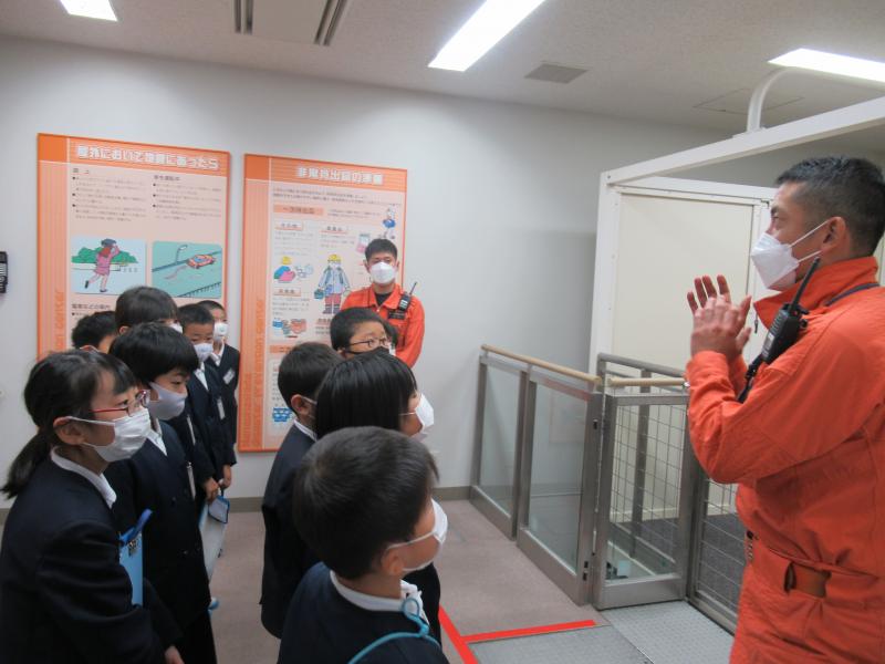 これまでの学習を通じて通信指令室,消防車を見学させていただき,消防士さんに質問をしたり,消防車について教えていただいたりしました。通信指令室の中が見えたとき,子どもたちは大興奮でした。電話番号を伝えて,自分の家がすぐに表示されたときも「すごーい」と声をあげていました。また,地震体験もさせていただきましたが,消防士さんに,何度も,「地震が起きたらまず机の下に入り,頭を守ることを忘れないでほしいと」言われていました。