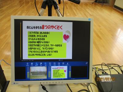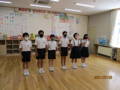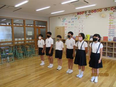 2021年7月20日 15時39分7月20日(火)1学期の終業式をオンラインで行いました。その中で、6年生に7月の暗唱を披露してもらいました。6年生の有志6名は緊張しながらも、しっかりと暗唱を披露してくれました。その後、生徒指導主事の岩島先生から「夏休み中の命と心を守る8つのやくそく」についてのお話がありました。やくそくを守り、安全で有意義な夏休みになるといいですね。