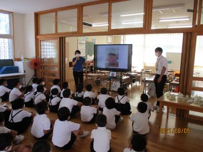 七尾警察署の方と一緒に,合言葉である「いかのおすし」の確認をしました。また,児童参加によるデモンストレーションも行いました。自分事として捉え,考えることができました。