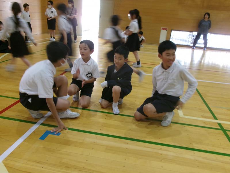 体育館は今も立ち入り禁止のため,できていなかった体育ですが,玄関スペースを広くしたり,会議室の物を動かしたりして少し広い場所を確保し,再開しました体育館用具庫から,玄関スペースでも使えそうな用具を先生達で相談して出してきました。マット,ラダー,なわとびなど,いつもの体育よりも大きな動きはできませんが,体を動かすことができると気持ちも晴れやかになりますね体育の最初にしている体つくり運動も,久々でしたが,3年生とても上手でした友達と一緒にタイミングを合わせてなわとびを跳ぶのもバッチリおみごとです